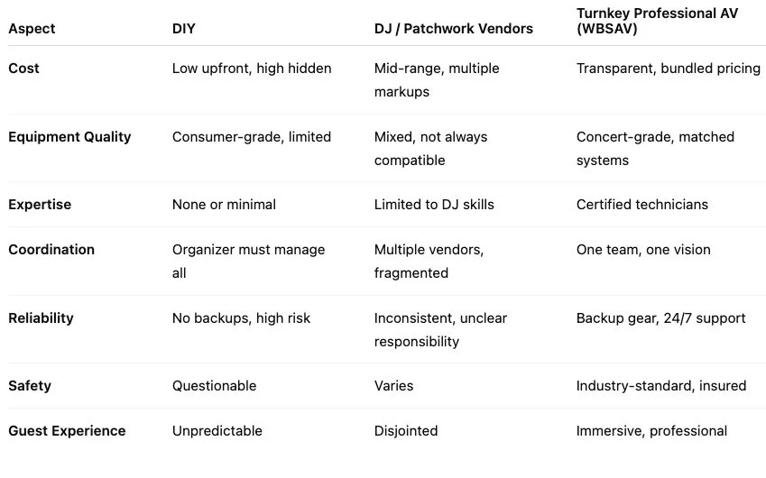 Let’s break down the risks and rewards of each approach, and why seasoned planners increasingly turn to well-established turnkey AV providers like WBSAV for safety, quality, and peace of mind.